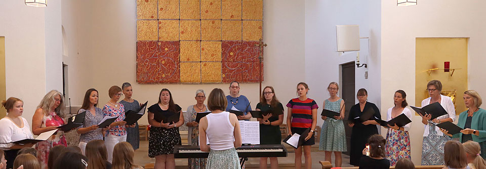 Unser Frauenchor Vocalista probt immer donnerstags ab 19:15 Uhr im Pfarrheim Aschheim. Das Repertoire ist vielseitig und umfasst moderne geistliche und weltliche Lieder, drei- bis vierstimmig gesungen. Wir gestalten mittlerweile regelmäßig die Firmung, diverse Gottesdienste im Pfarrverband und auch bei Hochzeiten dürfen wir immer mal wieder den schönsten Tag musikalisch gestalten. Wir sind eine fröhliche Gruppe, die viel Spaß zusammen hat und freuen uns über weitere Stimmen, die es bei uns mal versuchen wollen!